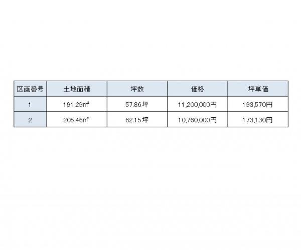| 備考 | ・ハーバーハウス株式会社の建築条件付きです。 ・仲介手数料が発生します。 ・敷地図の敷地面積については、面積確定前の為、差異が生じる場合があります。 【区画1】上下水道・ガス敷地内引込済。 【区画2】上下水道・ガス現況前面道路、売主負担にて敷地内へ引込みのうえ引渡し。 - |